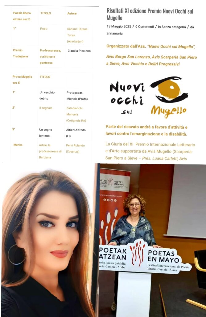 Şair, ədəbiyyatşünas, filologiya elmləri doktoru, dosent Təranə Turan Rəhimli İtaliyada XI “Mugello” Beynəlxalq Ədəbiyyat və Sənət Müsabiqəsinidə 1-ci yerin qalibi olub. Dünyanın müxtəlif ölkələrindən şairlərin qatıldığı müsabiqədə xaricdən seçilən yeganə qalib Azərbaycanlı şair olmuşdur. Digər yerlərin qalibləri İtaliyalı şairlərdir. Təranə Turan Rəhimlinin müsabiqəyə qatıldığı “Şairlər” adlı şeirini italyan dilinə görkəmli çağdaş italyan şairi və tərcüməçisi, professor Klaudia Piççinno tərcümə etmişdir. Qeyd etmək lazımdır ki, “Ən yaxşı tərcümə” noninasiyası üzrə mükafatın da prof. Klaudia Piççinnoya veriləcəyi elan olunub. Nüfuzlu beynəlxalq müsabiqədə 1-ci yerin qalibi kimi “Nuovi Occhi sul Mugello” Beynəlxalq Ədəbiyyat və İncəsənət Mükafatı”na layiq görülən Təranə Turan Rəhimli bilditib ki, müsabiqənin nəticələri 13 mayda elan edilsə də, ödül törəni iyun ayında gerçəkləşəcəkdir. 11 ildir ki, keçirilən müsabiqəyə bütün qitələrdən çox sayda əsər daxil olsa da, onların içərisindən 242 əsər müsabiqədə iştirak etmək hüququ qazanıb. Müsabiqə tələblərinə cavab verən həmin bədii mətnlər, eləcə də yer tutan qaliblərin əsərləri “Mugello” antologiyasında nəşr edilib. Mükafatlar isə yalnız 1-ci, 2-ci və 3-cü yerin qaliblərinə təqdim olinacaqdır. Müsabiqənin Təşkikat Komitəsi və Mükafat Komissiyası tərəfindən ödüllərin təqdimetmə mərasiminin 14 iyun 2025-ci il saat 16:00-da Barberino di Mugello Corsini Teatrında keçiriləcəyi bildirilib. Müsabiqə münsifləri ölkənin tanınmış ədəbiyyat və elm xadimləri — Silvia Calzolari, Simona Chiesi, Marzia Carocci, Alessandra Prospero, Gastone Cappelloni, Emanuele Martinuzzi, Fabio Fratini, Ilde Rampino, Eleonora Marchiori, Paolo Marini, Claudia Piccini, Serena Pinzani, Ezio Alessio Gensini, Alessandra Barucchieri, Silvia Carletti, Silvana Stremiz, Federico Del Monaco, Gabriella Vallini idilər. Təranə Turan Rəhimli mötəbər ədəbi müsabiqədə 1-ci yerin qalibi olması haqqında təəssüratlarını belə ifadə edib: “Şeirimin tərcüməçisi, görkəmli italyan şairi, əziz bacım, prof. Klaudia Piççinno sevinclə bu xəbəri mənə verəndə “Xaricdən mükafat qazanan yalnız sənsən” deyə xüsusi vurğuladı. Bu möhtəşəm qalibiyyətdən böyük şərəf duydum. Əzizim, Kllaudiaya, ədalət prinsipi ilə çalışan dəyərli münsiflərə, müsabiqənin təşkilat komitəsinə və mükafat komissiyasına sonsuz təşəkkürlərimi bildirirəm. Bu günədək 50-dən çox ölkədə 37 dilə tərcümə olunan əsərlərimlə çağdaş milli ədəbiyyatımızı təbliğ etməkdən şərəf duymuşam və hər uğurumda öz-özümə bu sözləri pıçıldamışam: “Səni təmsil etmək gözəldir, Vətən!”